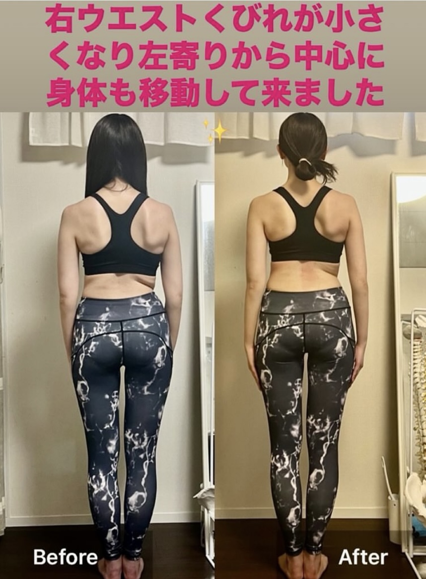 左腰の歪みが小さくなり、姿勢も改善されてきて猫背や肋骨、お腹が前になる立ち方なども