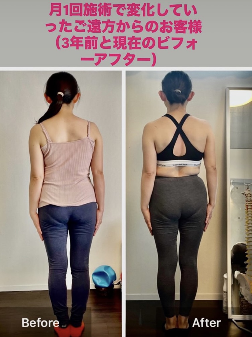 ご遠方の方は月に1回でも変わり方はスローですが、少しずつ変化していきますので矯正がキープ出来るように姿勢改善に向けたエクササイズを特に頑張っていただいております。