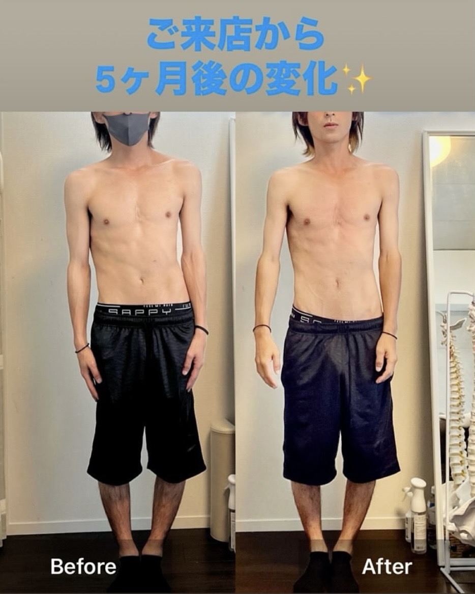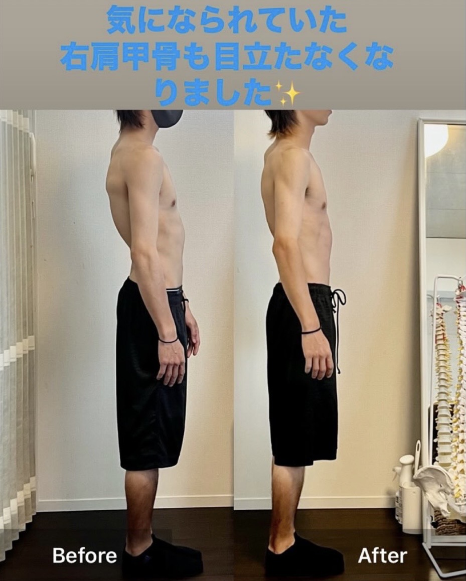 右凸ですと左側の肋骨の骨の間が狭くなっているお客様が多いのですが、角度が改善された方は左側の肋骨の骨と骨の間がやや広がっている方もレントゲン上、見受けられます。